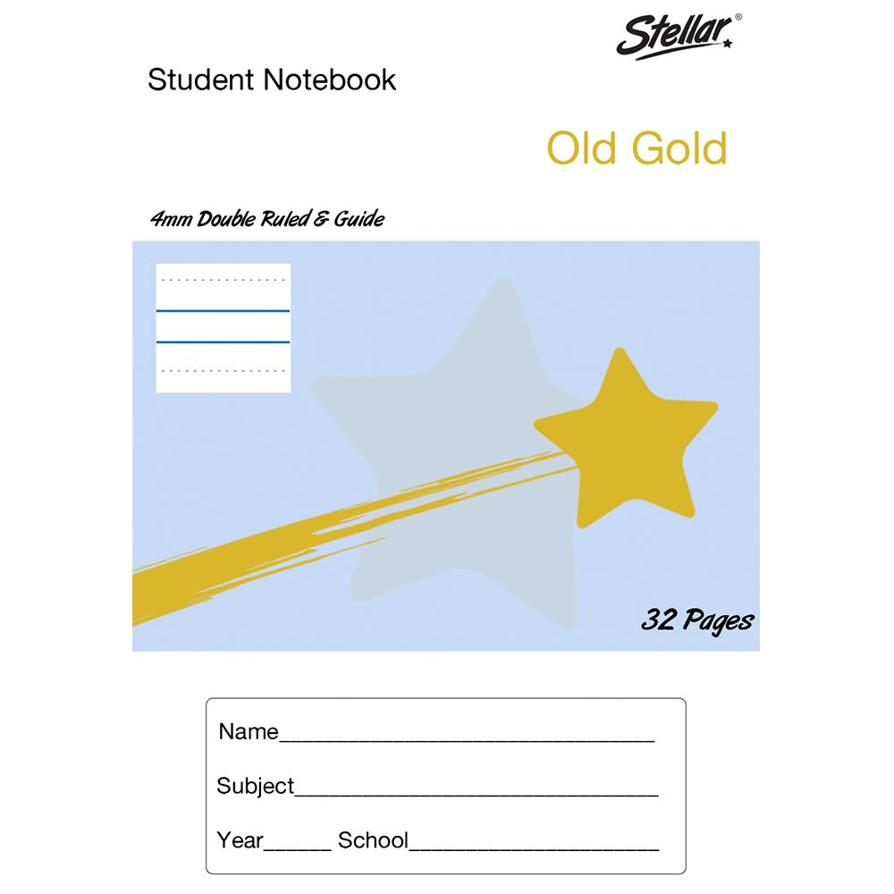 Old Gold Student Notebook size with 32 page portrait 4mm Double Ruled and Guide.